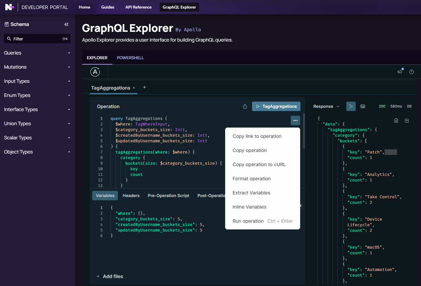 - In GraphQL Explorer, expand the left navigation Queries or Mutations menu.