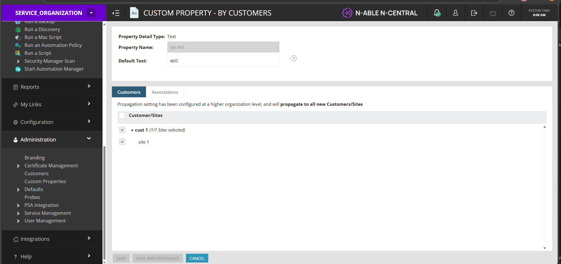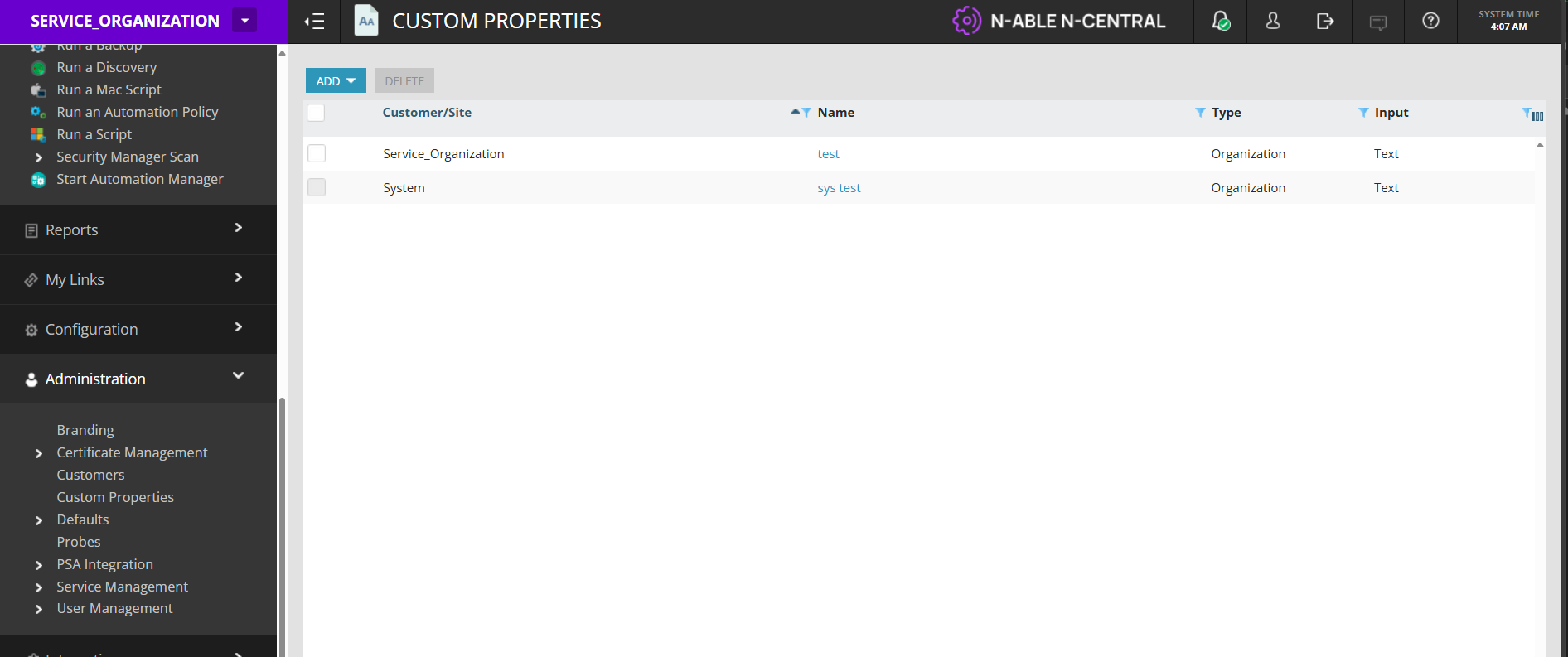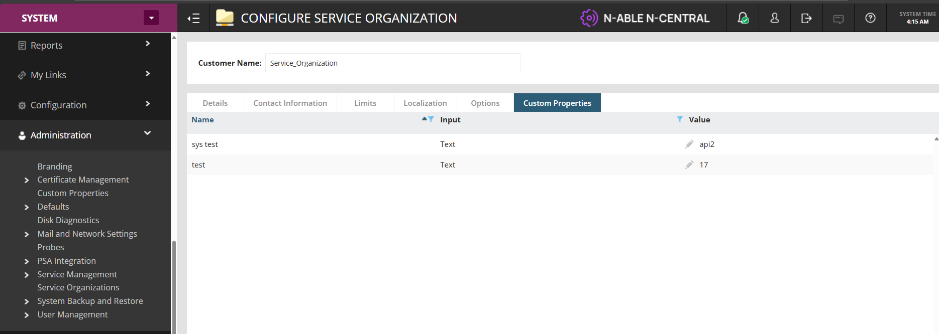 N-central's Custom Properties APIs enable you to manage and customize property configurations across your organization's hierarchy. These APIs allow you to create, retrieve, and update custom properties for both devices and organization units, providing flexible configuration management capabilities.